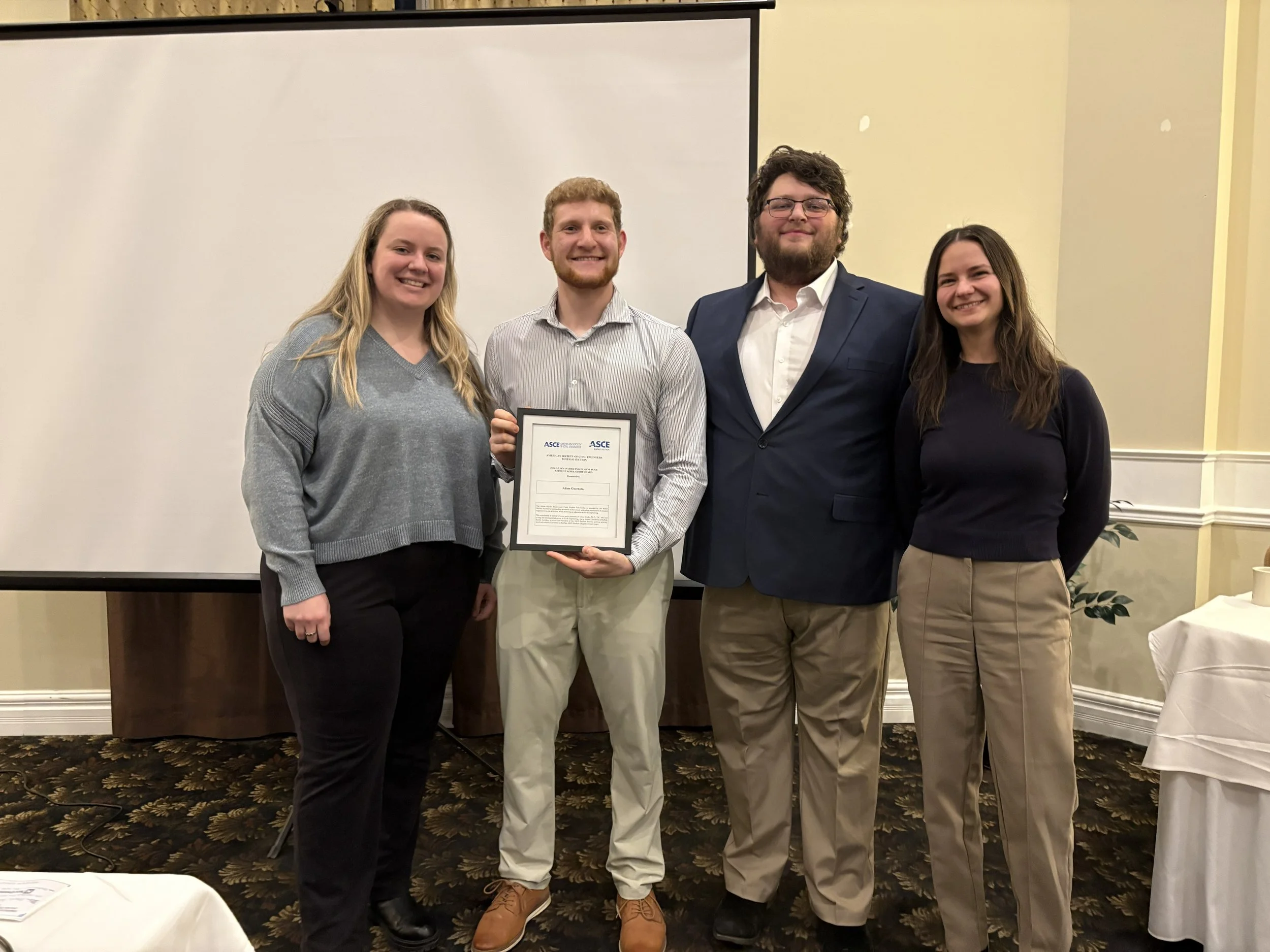 The Julian Snyder Endowment Fund, Student Scholarship is awarded by the ASCE Buffalo Section for academic achievement, and active participation in student organizations and activities, while pursuing an education in Civil Engineering. The scholarship is named in honor of Julian Snyder, Ph.D., P.E., who has had a long and distinguished career in Civil Engineering, is a former University at Buffalo faculty member, a twice Past President of the ASCE Buffalo Section, and was actively involved with the University at Buffalo ASCE Student Chapter over many years.